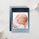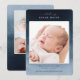 Elegant modern watercolor bohemian style birth announcement design with abstract blue and navy blue tone detailing. Script introducing line, and modern clean sans serif typography fonts. Space on the front for a large single photo along with birth statistics including birth date and time, as well as a baby's weight, length, and short line with parents' names. Back side features two additional photo spaces.