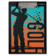 Perfect for the golf fan, this clip board features an abstract graphic rendering of a golfer in full swing. The text GOLF appears at the side. The image is in black, orange, and teal blue, with your name or other custom text in light grey at the top. You may easily remove the text if you'd like. Both sides of the clipboard have the same image and text. *Clip art used in this design is copyrighted by Encore Software, Inc., which permits use to its licensors. All rights reserved.