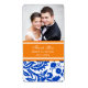 Elegant Wedding thank you custom photo template labels in stylish and contemporary orange, royal blue and white with classic and romantic floral vintage damask pattern, the perfect addition to your wedding, available in a wide selection of matching wedding products. Perfect for wedding favours or wedding wine bottle labels.