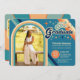 Introducing our retro-inspired Graduation Party Invitation, tailored for the trendsetting graduate! Immerse yourself in a palette of vibrant teal blues and oranges, complemented by bold typography reminiscent of 70's vibes, and adorned with rainbow arches and twinkling stars. The centerpiece? A captivating arch-shaped photo of the graduate, infusing a personal touch into your celebration.