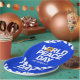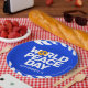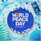 Celebrate the International Day of Peace (aka World Peace Day) on September 21 with these paper plates, which show a bright orange peace sign standing in for the letter O in world, encircled by laurel leaves on a calming blue background.