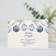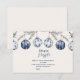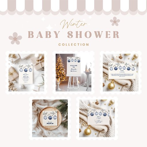 This elegant baby shower design features a trio of hand-painted blue Christmas ornaments hanging from twine and pine branches. With delicate snowflakes and botanical motifs in a soft watercolor style, this winter theme is perfect for celebrating a baby boy during the cosy holiday season.