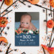Announce your Halloween baby boy with this cute Halloween themed baby announcement card in blue with Our little Boo is here written below a row of Halloween objects among greenery, like a pumpkin, a bat, a ghost, a cat, a witch hat, and skulls.