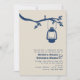 A wedding invitation with a camping / outdoors theme featuring an illustration of an oil lantern hanging from a tree branch with leaves. Colour scheme is blue. Personalise the text with details of your occasion.