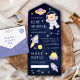 Amaze your guests with this modern space theme baby shower invite featuring a cute teddy bear in astronaut costume and modern typography with detachable diaper raffle card. Simply add your event details on this easy-to-use template to make it a one-of-a-kind invitation.