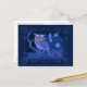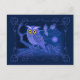 Original Blue Owl Art on tree branch with mountains, night sky, clouds and moon with decorative border, also original, on postcard.