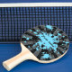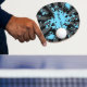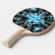 A ping pong paddle to personalise with your name in a blue paint splash design on black and grey stripes.