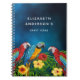 A college ruled notebook for your craft ideas for teen girls and women. A dark blue sky as background. Three parrots in blue, red and yellow sitting on green palm tree leaves. Yellow florals, flowers Hibiscus. Add your name and the book title. White text.