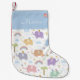 Give your little boy his own adorable pastel elephant pattern with this adorable Christmas stocking. Stocking has purple, blue, and yellow elephants and a blue background behind the first name of your little kid. There are also rainbows, birds, clouds, hearts, and flowers.