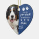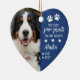 Heart-shaped pet memorial ornament to which you can two photos of your pet, one on each side. Add their name too and years living. You left paw prints on our hearts in a charming typography design in white on blue with paw prints and hearts. Remember your beloved pet who's passed with a heart-shaped Christmas ornament personalised with a photo of your dog or cat.