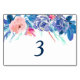 Here's a pretty wedding table card that uses blue as a primary colour, and embellishes it with touches of pink and peach. The top border is a bouquet image of peach and blue roses, with complementary pink violet flowers, blue, and aqua leaves. Below the floral border is the table number in blue. Everything is placed on a wedding white background. The back of the card is identical. Be sure to see the matching wedding products, including invitations, in our store.