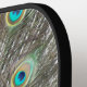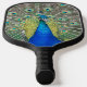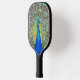 Pickleball paddle that features the photo image of a beautiful, blue Peacock with colourful feather plumage. Select your pickleball paddle handle colour as desired.