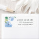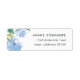 Elegant floral return address labels feature your name and address aligned at the right, accented with watercolor peony flowers in soft pastel blue and lush green leaves.
