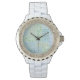 A chic White Enamel Rhinestone Wrist Watch, with a country-style Faux Patchwork of various pretty Periwinkle florals and coordinating Polka Dot, Striped and Plaid patterns in Pale Blue, Green and White. Part of the Posh and Painterly 'Periwinkle Patch' collection, this pattern can easily be adjusted to fit any Wrist Watch.