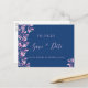 An elegant and trendy wedding Save the Date card. Blue background and golden text on front. Decorated with pink coloured botanical florals and foliage. Save the Date is written with a modern hand lettered style script. Templates for the wedding date and your text.