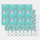 This set of Christmas gift wrap sheets features funny snowmen images on two of the sheets. The third sheet has matching images of brightly wrapped gifts, gingerbread men, candy canes and lollipops. The background for the predominantly blue, pink, white & green images is blue on two sheets, and white on the third. Cute for kids!