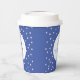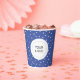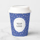 This minimal paper cup features a simple logo and pink brush confetti pattern on a bule background. Add your logo and customise the text with your information. You can use this personalised cup at your business place, shops, company event or, etc.