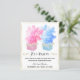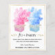 A budget baby shower or gender reveal invitation. On a white background the design consists of pink and blue surprise boxes, labelled miss and mister, with erupting elegant blue and pink smoke, and gold party decorations. The babies surname is written within the smoke in white typography text. The text reads it's a party, please join for a little miss or mister gender reveal. Personalise by adding your full event and contact details to the front and back.