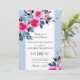 Elegant wedding invitation design featuring bright pink watercolor roses, blue and grey foliage on a white and blue background. Reverse side of the invitation is in dusty blue colour.