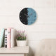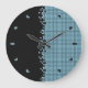 Custom wall clock for computer geeks with blue pixels grid and stray pixels hour markings. The black background can be changed to any other colour.