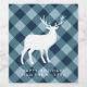 Celebrate the holidays by giving your friends and family wine with a custom label. The custom holiday wine labels feature a blue and navy plaid pattern, white stag silhouette, and placeholders for custom text.