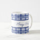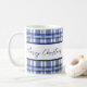 Lovely coffee mug with Merry Christmas in modern calligraphy with blue plaid background.