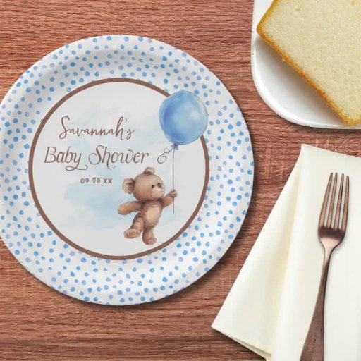 Blue Polka Dot Teddy Bear Baby Shower Favour Boxes An all-over polka dot print. FRONT: Personalised with your name and date. BACK: A teddy bear holding a blue balloon with a sky background. Customise the message on back. © Kimbellished, LLC