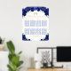 This elegant and glamourous Quinceañera table seating chart features a gold crown and beautiful dark blue floral arrangements with gold confetti. The text combines handwritten script and modern sans serif fonts for a classy and sophisticated look.