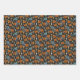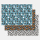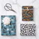 A set of wrapping paper sheets for Halloween featuring three patterns in matching styles: ghosts, skulls, ravens, bats and cats in blue, white, orange, and black; happy pumpkins and mushrooms with spiderwebs; and lots and lots of ghosts. Fun and kid friendly grey, black, and orange Halloween wrapping paper set for Halloween boy baby showers, Halloween boy birthday parties, and Halloween costume parties or any other fun and spooky Halloween event. Boy Halloween wrapping paper set for all your fun Halloween events in a blue version of the Halloween palette.