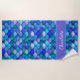 Ocean blue and nautical theme. Blue and purple mermaid scale pattern. Personalise and add a name, written with a modern hand lettered style script. White letters.