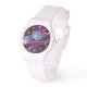 A watch with an abstract design with blue and purple layers with faux gold foil ribbons in between.