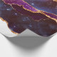 Wrapping paper with an abstract design with blue and purple layers with faux gold foil ribbons in between.