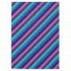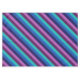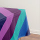 A 60” x 84” tablecloth featuring a colourful pattern design of diagonal stripes in cool teal, ocean blue, navy blue, plum purple, and lavender.