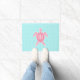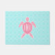 A doormat featuring an illustration of a pink sea turtle over a bright blue quatrefoil background. Personalise the monogram.