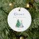 Blue Bunny Rabbit Baby's First Christmas Custom Name Round Ceramic Ornament — The precious personalised xmas ornament template features an adorable watercolor rabbit, standing beside a festive christmas tree with lovely wrapped gifts. The text boxes allow for easy customisation of any baby's name in a handwritten calligraphy script font, and birth year in a simple, minimalist sans serif. Both sides of this personalizable, gender neutral keepsake tree decoration are identical.