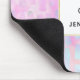 A mouse pad with an abstract background pattern. Pink purple and blue watercolors make up this artistic design which features vertical rectangle shapes on a soft mottled background. A square layered over top with a faux gold foil border, your personalised text inside.