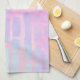 Kitchen towel with an abstract background pattern. Pink purple and blue watercolors make up this artistic design which features vertical rectangle shapes on a soft mottled background.