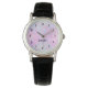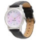 A watch with an abstract background pattern. Pink purple and blue watercolors make up this artistic design which features vertical rectangle shapes on a soft mottled background.