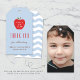 Created to coordinate with the "Wavy Apple" preschool graduation announcement collection, this party favour gift tag features a sweet, halftone apple illustration with a "Class of (Year)" text overlay. Beneath the illustration is a "Thank You" greeting, followed by the custom message and details. The text and design is placed over a solid blue background. The back of the tag features a coordinating blue and white wavy pattern. (Note: For a more custom design, replace the wavy backer with a photo of your child.)