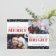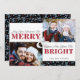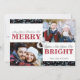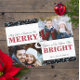 TeeLofts' 2-photo Christmas pattern card design features Merry & Bright bold modern typography and a light grey ampersand overlaid over the design elements. The design is accented with holiday greenery line art in cornflower blue green and dark red which is repeated on the back. It's easy to add your family names and two photos. The reverse side is dated with the year. #Christmas #Holidays #ChristmasCards