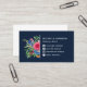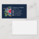 Pretty floral business card in white with a bouquet of pink, red, blue, purple, and orange flowers, and greenery and berries on dark blue. Add your social media handles next to white icons.