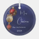 An navy blue uneven coloured background. Decorated with red and gold baubles. Personalise and add your name, year. Text: Merry Christmas