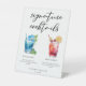 This chic coastal signature cocktails pedestal sign features simple black typography above 2 seaside drinks and their ingredients for your beach wedding bar. A cute Blue Lagoon and Dirty Shirley or cherry drink drawing add a cool flair to your bar menu. Complete with the couple's names and date for their reception.
