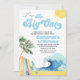 Blue retro heading surf or wave first birthday invitation for a baby boy featuring a beach, palm trees, surfboards, sun and birds.