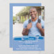 A furling, blue, ribbon with a white trim on a blue backdrop holds your graduation celebration details. Just add your favourite photo to make it yours!