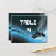 Blue road biker wedding table number postcard, featuring a motorcycle on an abstract gradient blue, white, black background and a white mesh. Some elements courtesy of Clipartandfonts.com.