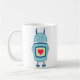 Blue robot mug with a cartoon illustration of a blue clumsy cartoon robot holding a plate with a heart. This cute mug is suitable for kids and geeks who love robots and cute illustrations.
