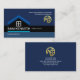 Design features a blue shades cover accentuated by a creative blue home roof design at the left face of the card. The blue roof home houses your prestigious name and job title in a black column with the business name just underneath. Northwards to the right corner are the contact details and a gold tree home logo that you can use.