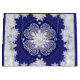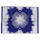 Snowflake with my drawing of a stained glass window from an old European church: a rose window, with touches of a wide variety of colours, including shades of blue, on a navy blue background. Inlay of light blue rhinestones (drawn). For an old times winter pattern. This motif is also available in cardinal red in my “cardinal red rosace” collections.
