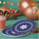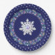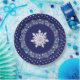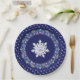 Snowflake with my drawing of a stained glass window from an old European church: a rose window, with touches of a wide variety of colours, including shades of blue, on a navy blue background. Inlay of light blue rhinestones (drawn). For an old times winter pattern. This motif is also available in cardinal red in my “cardinal red rosace” collections.